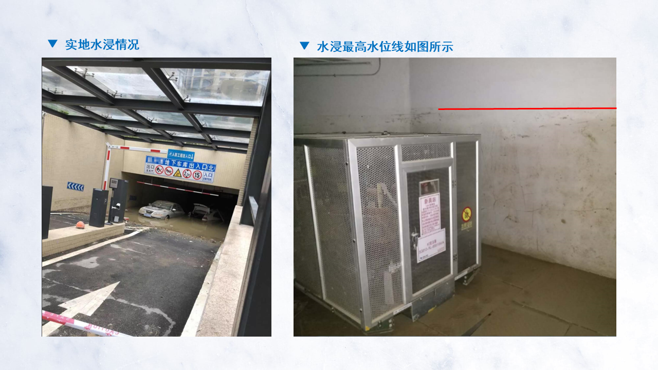 受超强台风“山竹”袭击,开平某小区地下停车库水淹严重,位于车库的5台敞开干变全部被水没顶浸泡超过24小时,经简单处理后,现场检测各项指标正常,可立即恢复正常供电。
