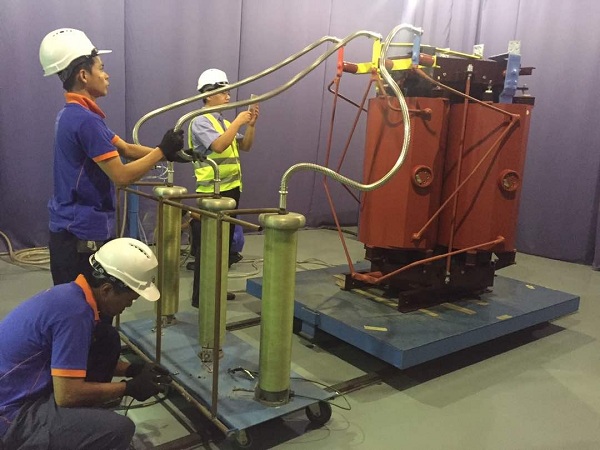 现场生产的两台干变样机均一次性通过所有例行试验,其中空载损耗、负载损耗、局部放电实测值均远优于当地标准及客户要求。局部放电试验被委托在第三方进行,我司技术人员在试验现场与客户和试验人员就试验方法、设备校验等方面进行了详细沟通,客户对我司在试验方面专业、严谨的态度给予充分的认可。