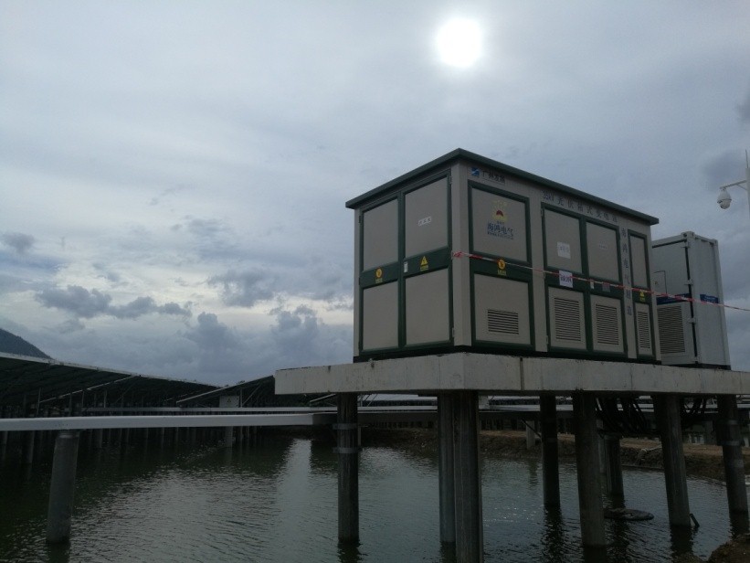 在位于台山市的广阔滩涂地上,一面面悬空在水面上的太阳能板在阳光的照射下发出耀眼的光芒——这是广州发展台山渔业光伏产业园50MW项目的现场,700亩咸围上高高架设着的大面积的光伏发电设施很是壮观,一台台杏耀平台登录入口制造的欧式变电站点缀其中。