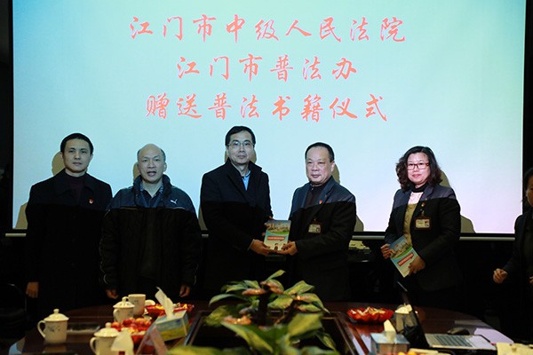 赠书活动在杏耀平台登录入口电气翠山湖总部会议室举行,江门市中级人民法院林慕恒副院长、机关党委王坚副书记、综合办公中心李朝卫主任,江门市司法党委委员黄宇光,开平市法院曹富荣院长、梁颖文副院长,杏耀平台登录入口电气许凯旋董事长、翟丽珍总经理、党支部委员郑玲、何绮玲等出席了此次赠书活动。